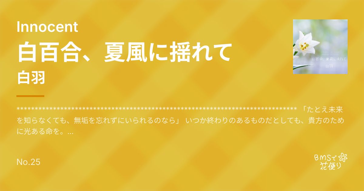 ***************************************************************************** 「たとえ未来を知らなくても、無垢を忘れずにいられるのなら」 いつか終わりのあるものだとしても、貴方のために光ある命を。 ***************************************************************************** [SINGLE PLAY] [BEGINNER] : ☆x2 [NORMAL] : ☆x4 [HYPER] : ☆x7 [ANOTHER] : ☆x11 [INSANE] : ☆x12 [DREAM] : ★x? ***************************************************************************** 白羽です。 事情あって余裕のない制作になったのですが、お楽しみ頂ければ幸いです。 ***************************************************************************** 白羽 https://twitter.com/shiroha_F14 https://soundcloud.com/shiroha-f14