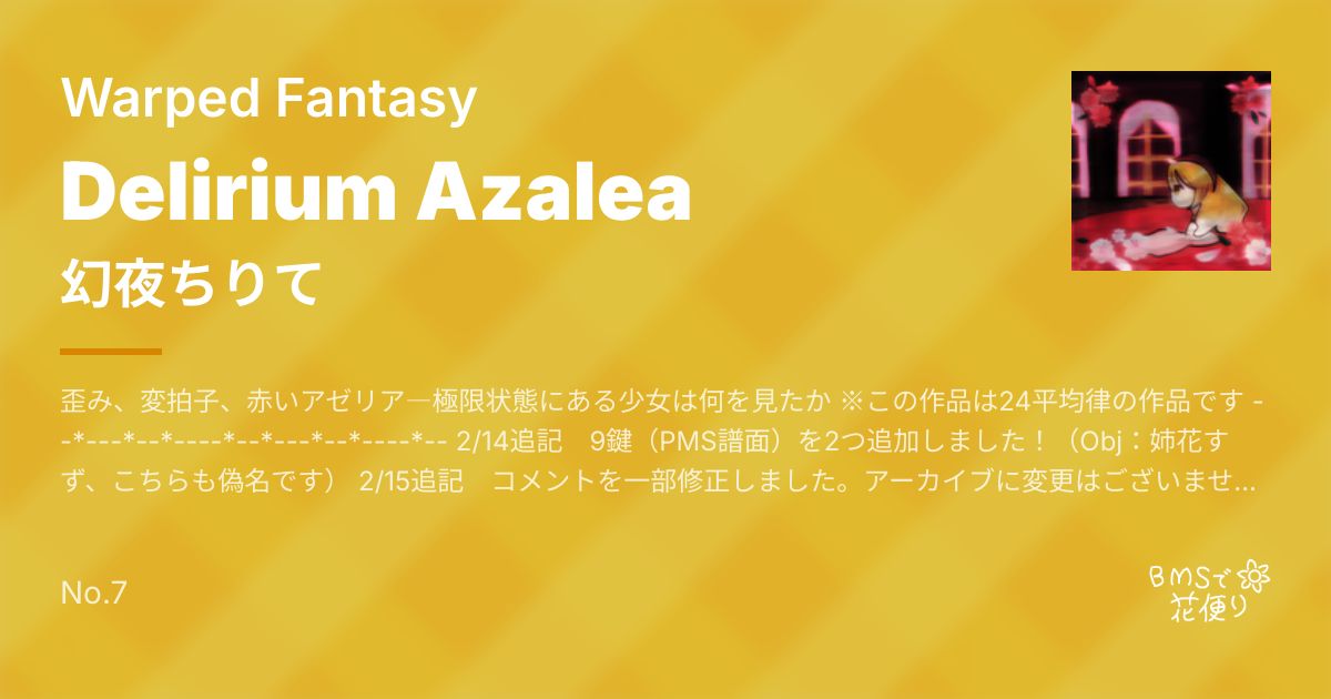 歪み、変拍子、赤いアゼリア―極限状態にある少女は何を見たか ※この作品は24平均律の作品です --*---*--*----*--*---*--*----*-- 2/14追記 9鍵(PMS譜面)を2つ追加しました!(Obj:姉花すず、こちらも偽名です) 2/15追記 コメントを一部修正しました。アーカイブに変更はございません --*---*--*----*--*---*--*----*-- BGI、バナー画像、ステージファイルはkahluamilchenさんに描いていただきました! この場をお借りして感謝申し上げます。
