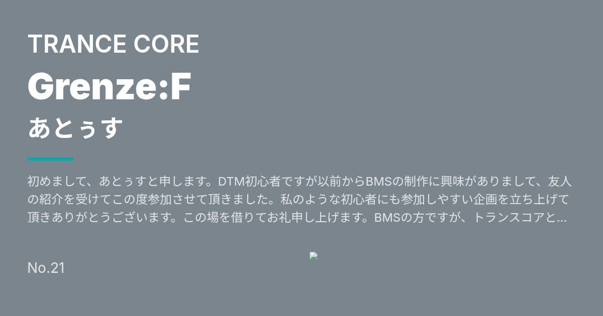 初めまして、あとぅすと申します。DTM初心者ですが以前からBMSの制作に興味がありまして、友人の紹介を受けてこの度参加させて頂きました。私のような初心者にも参加しやすい企画を立ち上げて頂きありがとうございます。この場を借りてお礼申し上げます。BMSの方ですが、トランスコアと称しておりますがあまり音楽に堪能ではないのでジャンル違いかもしれません…拙作ですが一生懸命制作致しましたので遊んで頂けると嬉しいです。よろしくお願いします!