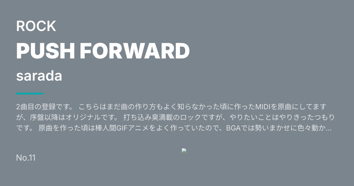 2曲目の登録です。 こちらはまだ曲の作り方もよく知らなかった頃に作ったMIDIを原曲にしてますが、序盤以降はオリジナルです。 打ち込み臭満載のロックですが、やりたいことはやりきったつもりです。 原曲を作った頃は棒人間GIFアニメをよく作っていたので、BGAでは勢いまかせに色々動かしまくってます。 さすがに全編使い回し無しにする気力は持ちませんでしたが、見応えはあると思います。 試聴はこちらからどうぞ↓ https://www.dropbox.com/s/l6yl4i1zd60kzhk/PUSH%20FORWARD.mp3?dl=0