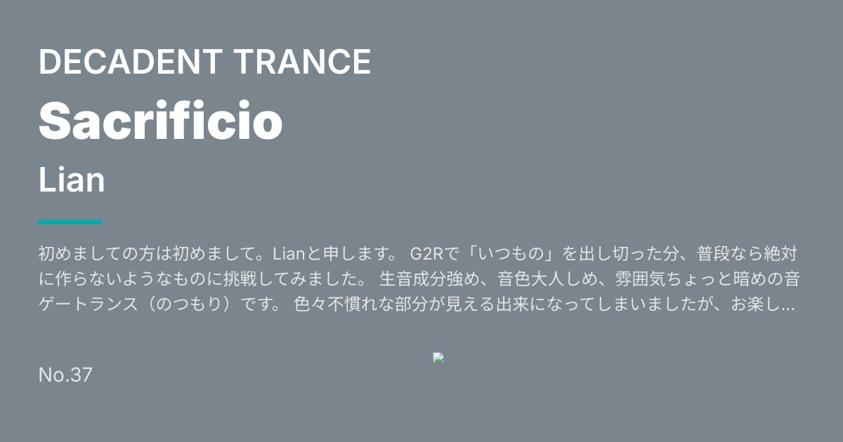初めましての方は初めまして。Lianと申します。 G2Rで「いつもの」を出し切った分、普段なら絶対に作らないようなものに挑戦してみました。 生音成分強め、音色大人しめ、雰囲気ちょっと暗めの音ゲートランス(のつもり)です。 色々不慣れな部分が見える出来になってしまいましたが、お楽しみ頂ければ幸いです。