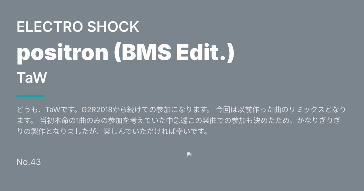 どうも、TaWです。G2R2018から続けての参加になります。 今回は以前作った曲のリミックスとなります。 当初本命の1曲のみの参加を考えていた中急遽この楽曲での参加も決めたため、かなりぎりぎりの製作となりましたが、楽しんでいただければ幸いです。