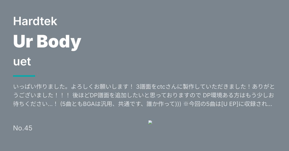 いっぱい作りました。よろしくお願いします! 3譜面をctcさんに製作していただきました!ありがとうございました!!! 後ほどDP譜面を追加したいと思っておりますので DP環境ある方はもう少しお待ちください…! (5曲ともBGAは汎用、共通です、誰か作って))) ※今回の5曲は[U EP]に収録されております、良ければどうぞ! https://hardcore-teknology.bandcamp.com/album/hctk-003-u-ep