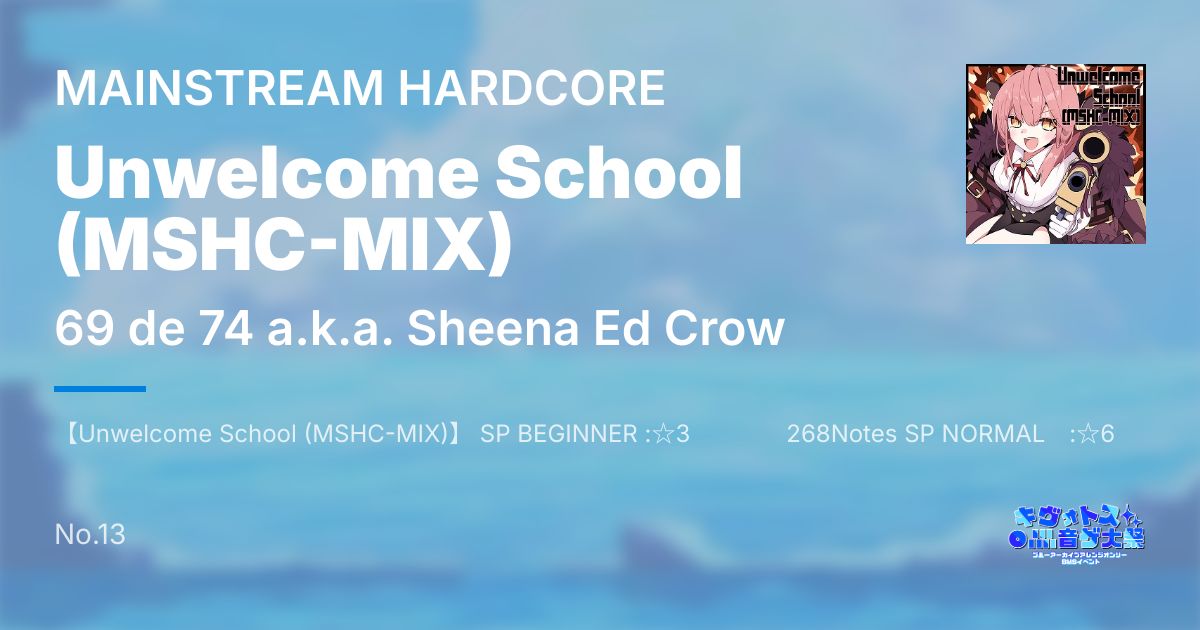 【Unwelcome School (MSHC-MIX)】 SP BEGINNER :☆3 268Notes SP NORMAL :☆6 568Notes SP HYPER :☆10 1068Notes SP HARD :☆11 1468Notes SP ANOTHER:☆12(★7/sl4)2068Notes [F] :★14 2468Notes DP NORMAL :☆5 568Notes DP HYPER :☆9 1068Notes DP HARD :☆11 1568Notes DP ANOTHER :☆12(★5前後)1868Notes 9Key NORMAL:LV31 568Notes 9Key HYPER :LV44 1068Notes 9Key EX :LV49(●7前後)1468Notes ドーモ。シーナ・エド・クロウことロクデナシです。 今回は、みんな大好きUnwelcome Schoolを、 原曲の良さをそのままに、攻撃的なアレンジを施しました。 みんな大好き陸八魔アル社長は発狂皆伝久田イズナこと、 はしたかさんに描いて頂きました。 ミスると社長の威厳が崩壊するぞ!頑張れ! バチゴリのガツガツに楽しんで頂けると、幸甚。 Let's Go!!!!!!!!!!!!!!!!!!!!!!!!!!!!
