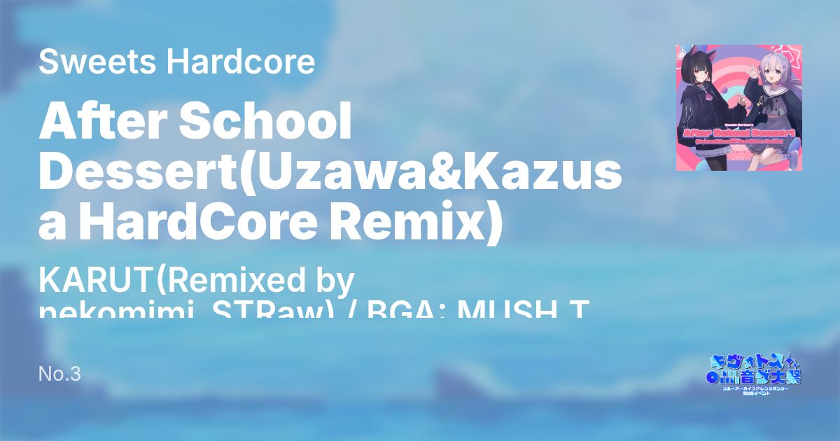 スイーツっていいですよね! うーん、ロマン! Sound:KARUT(Remixed by nekomimi_STRaw) BGA: MUSH.T illustration:あろわな(https://lit.link/aro07060) Obj:nekomimi_STRaw SP Chocomint ☆7 (NORMAL相当) SP Semla ☆10 (HYPER相当) SP Miracle 5000 ☆12 (ANOTHER相当) Obj:rat SP キャスパリーグ ☆14 (INSANE相当) Obj:NASA 9keys NORMAL [ご挨拶申し上げます!] ☆30 9keys HYPER [正義は必ず勝つんです!] ☆42 9keys ANOTHER [挑戦状を!受け取って!くださいっ!] ☆49 ~コメント~ ブルアカ三周年先生のnekomimi_STRawです! 宇沢(U)とカズサ(K)でUK Hardcore、なんちゃって! ウッキウキでキヴォトス音ゲ大祭の準備をしてまいりましたが無事お披露目できることとなり胸を撫でおろしています。 復刻イベントで読むことの出来るようになったレイサとカズサの絡みが尊すぎたのでこれにしよう!!!となりました。イェイ! シンプルながら普段の作風からは大分背伸びしている感じになった感もありますが、 ノリノリでとにかく楽しく!という方向性もたまにはいいでしょう! お祭りだし! 今回は制作前段階からムッシュ竹崎さんにBGAのご相談をさせていただき、今回ご担当いただきました・・・! あろわなさんの素敵なイラストも相まってかなりいい感じになったんじゃないでしょうか! やったぜ! また、差分制作にratさんとNASAさんをお招きしております。ありがてぇ!!!! ※最後に一つ。今回の作品に思いを込めに込めたので、レイサと通常カズサがガチャで引けますように・・・!