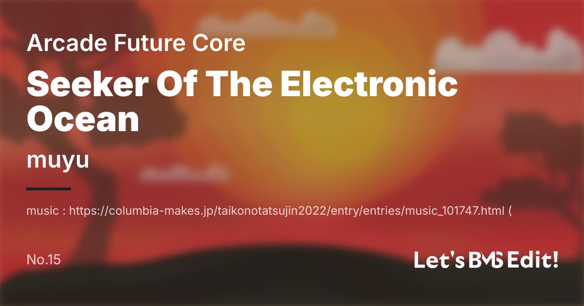 music : https://columbia-makes.jp/taikonotatsujin2022/entry/entries/music_101747.html ( https://twitter.com/muyu_pianoN/status/1539531606628909057 ) (こちらはbmsonオンリーの作品となります) 皆様こんにちは、OYAKIと申します。 今回はmuyuさんのSeeker Of The Electronic OceanをBMS化しました。 INSANE譜面をhyukiさんに制作していただきました。 hyukiさん、ありがとうございます! 楽しんでいただけたら幸いです。 以上、OYAKIでした。