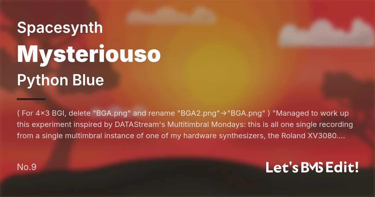 ( For 4x3 BGI, delete "BGA.png" and rename "BGA2.png"->"BGA.png" ) "Managed to work up this experiment inspired by DATAStream's Multitimbral Mondays: this is all one single recording from a single multimbral instance of one of my hardware synthesizers, the Roland XV3080. Most of the sounds are courtesy of the expansion cards I have for it, but all the same, enjoy!" -Python Blue When "Let's BMS Edit" was announced I asked a few friends if I can collab with them on making one of their songs available to players. "Myseriouso" was definitely a song I felt had the perfect feeling of drifting in space. To help with the feeling of "space" I decided to give some sections muted keysounds. Since this Song was originally rendered in one-take, it took a while to figure out how to seperate the channels, but eventually we managed to get the keysounds we needed. Music by Python Blue. https://twitter.com/Python_Blue BGI by Ayanaki. https://twitter.com/noc_loft BMS by Daniel Rotwind. https://twitter.com/Teufelstruhe264 Originally Released on BandCamp on February 15, 2021 https://python-blue.bandcamp.com/track/multitimbral-mondays-mysteriouso