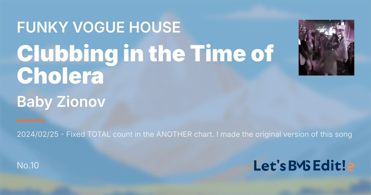2024/02/25 - Fixed TOTAL count in the ANOTHER chart. I made the original version of this song in 2020, near the beginning of the COVID lockdowns. Since we weren't allowed to go out and didn't know when the lockdown would end, parties were really starting to feel like a thing of the past. So this song is meant to evoke nostalgia for parties, and more specifically, for the ritual of getting ready to go to a party: choosing an outfit, wrangling your friends to all go together, getting tipsy with your friends beforehand, building anticipation and excitement. In truth, I often find this "pre-drinks" phase of the night to be more fun than the party itself! The BGA combines stock footage with random footage of parties I went to or DJed at in 2023. Sorry for the occasionally poor video quality; I was using my phone, and dingy nightclubs rarely have good lighting anyway, LOL. Thank you to Emelia, who provided the Japanese subtitles for the BGA! This is a BMS edit of the extended club version, released on February 11, 2022: https://babyzionov.bandcamp.com/track/clubbing-in-the-time-of-cholera-12-club-mix The original song was released May 29, 2020: https://babyzionov.bandcamp.com/track/clubbing-in-the-time-of-cholera