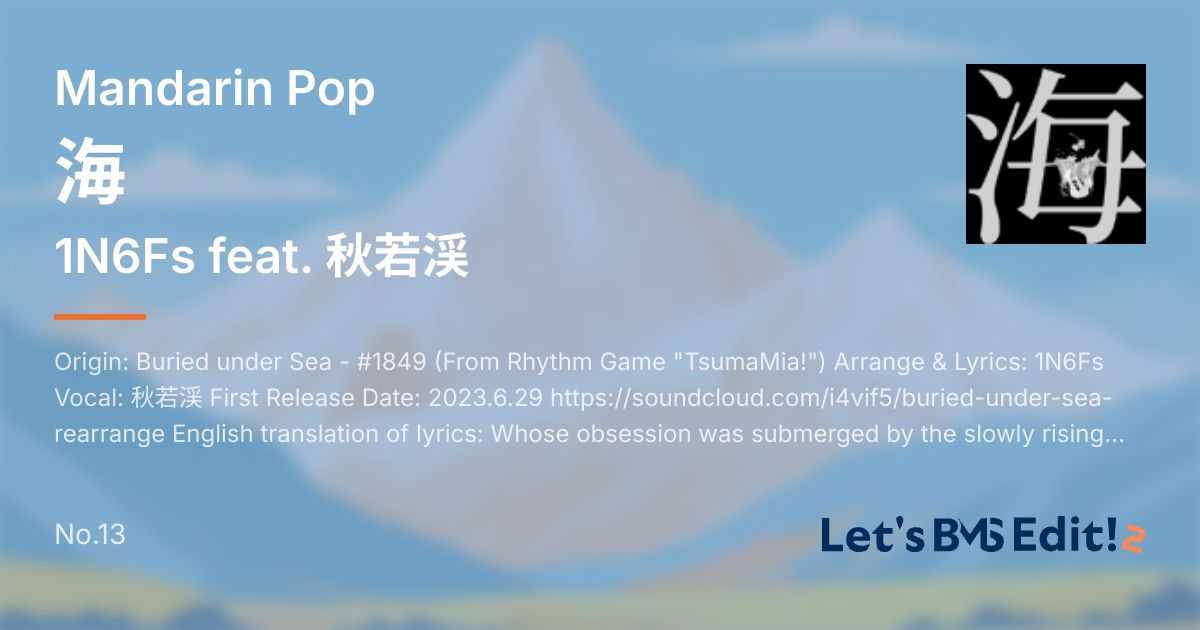 Origin: Buried under Sea - #1849 (From Rhythm Game "TsumaMia!") Arrange & Lyrics: 1N6Fs Vocal: 秋若渓 First Release Date: 2023.6.29 https://soundcloud.com/i4vif5/buried-under-sea-rearrange English translation of lyrics: Whose obsession was submerged by the slowly rising sea level? Sea wave dashed against the false vow The love had been grounded after floating The letter paper that was carried by the drifting bottle recorded the last page of love The interwined affection that drifted with the tide was just a flash in the pan My heart was shrouded in the thick mist I lost my way and didn't know where to go Lightspot was glimmering Where was the terminal of chaotic dream? Distant meteors streaked across the lonely night sky Then they rushed towards the vast sea in a flash As the tide was gradually faded, I picked up the wet sand and piled up the spacetime which only I exist The solemn pledge of love that you once made had become a empty dream And it was immediately engulfed in the surging waves Only the gentle sea breeze softly licked my invisible and painful wound The wind is drifting away, but it's hard to find a trace after all It silently flows into the vast sea Overlooking the distance, seagulls carry nameless sorrow and fly towards the final sunset No longer clutching my fragmented dreams in my hands I jump into the raging waves Let the cold sea nibbles away at my residual temperature Freeze the pain inside my heart.