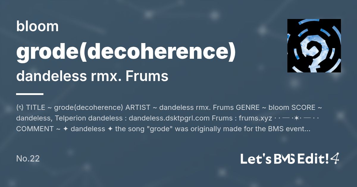 (ৎ) TITLE ~ grode(decoherence) ARTIST ~ dandeless rmx. Frums GENRE ~ bloom SCORE ~ dandeless, Telperion dandeless : dandeless.dsktpgrl.com Frums : frums.xyz · · ─ ·✶· ─ · · COMMENT ~ ✦ dandeless ✦ the song "grode" was originally made for the BMS event "PABAT:2023". the song was originally a throwaway, but I turned it into BMS to test my skills. It didn't place very well but I was still happy with the results. later on, I became aware of an in-development freeware PC rhythm game called "vivid/stasis". at the time, they were accepting music submissions, and not expecting much out of it, I submitted a few songs that I was working on, grode included. to my complete surprise, grode was accepted into the game. when the game finally released as an open beta, I opened the game, pressed the "song select" button, and was blown away to immediately hear grode. it was set as the first song you play in the whole game!! I never expected how popular vivid/stasis would become shortly after release either, and due to it's strange name (and to my dismay), grode became a meme in the community ;-;. if you look at the youtube upload of the song, there are hundreds of comments saying only "grode". it was great to gain so much exposure, but at the same time, I could tell I wasn't being taken seriously. in the year following the game's release, it became a trend among vivid/stasis community members to remix grode in their own style. I was happy to see all the ways people changed my composition and I thought that would be the end of it. I was surprised again when, on April fools day, vivid/stasis held an event where multiple grode remixes were playable in game. I couldn't believe it. a few days later, I see the announcement: "vivid/stasis will be adding a grode remix by Frums: grode(decoherence)". For reference, I grew up playing rhythm games, and Frums has been one of my favorite artists in the scene for a long time. so to hear that the development team went out of their way to commission Frums to remix my work, I felt blessed. When it came time for me to release my album "dsktp world", I decided to include grode(decoherence). During the process of getting permission, I was given access to the original project file. Frums uses the music software "Renoise", as do I. There is an incredibly powerful Renoise plugin that automates much of the creation of BMS, so I immediately thought to convert it. I missed last year's Let's BMS Edit 3, and when Let's BMS Edit 4 was announced, I was ready to start working. so, please enjoy this BMS, it holds a very special place in my heart. (ৎ)