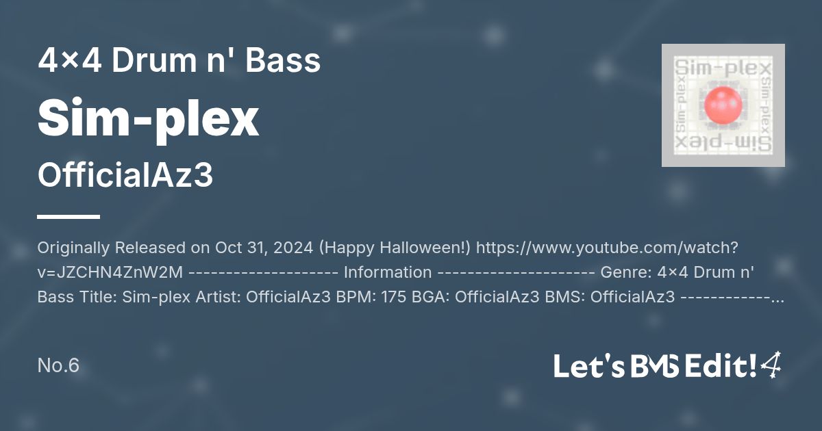 Originally Released on Oct 31, 2024 (Happy Halloween!) https://www.youtube.com/watch?v=JZCHN4ZnW2M -------------------- Information --------------------- Genre: 4x4 Drum n' Bass Title: Sim-plex Artist: OfficialAz3 BPM: 175 BGA: OfficialAz3 BMS: OfficialAz3 ---------------------- lang=en ----------------------- Sim-plex, a track which sounds really simple to listen to but is secretly complex. Hence, the title. In addition, the hyphen was put in the middle to prevent trademark infringement. Originally made for Arcaea Song Contest - 4th Movement "Coalescence" And also, this entry was made possible due to my 7 month old promise. --------------------- Difficulty --------------------- (7key) SP Beginner - *** (3) SP Normal - ******* (7) SP Hyper - ********** (10) SP Another - ************ (12) (14key) DP Another - ************ (12) (5key) 5K SCR Hard - ******* (7)