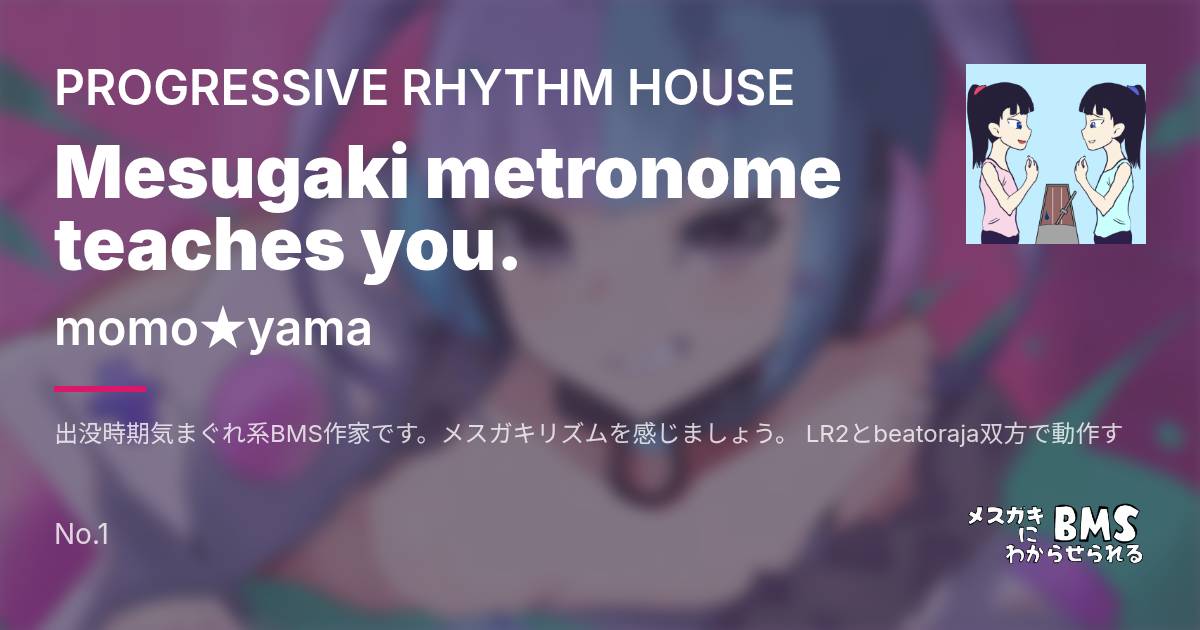 出没時期気まぐれ系BMS作家です。メスガキリズムを感じましょう。 LR2とbeatoraja双方で動作するはずですが、readmeにてLR2でプレビューできない文字コードを使用しているためLR2のテキストプレビューに対応しておりません。なんかそれとかが悪さしそうな予感もあるので、他の不具合があったらごめんなさい。