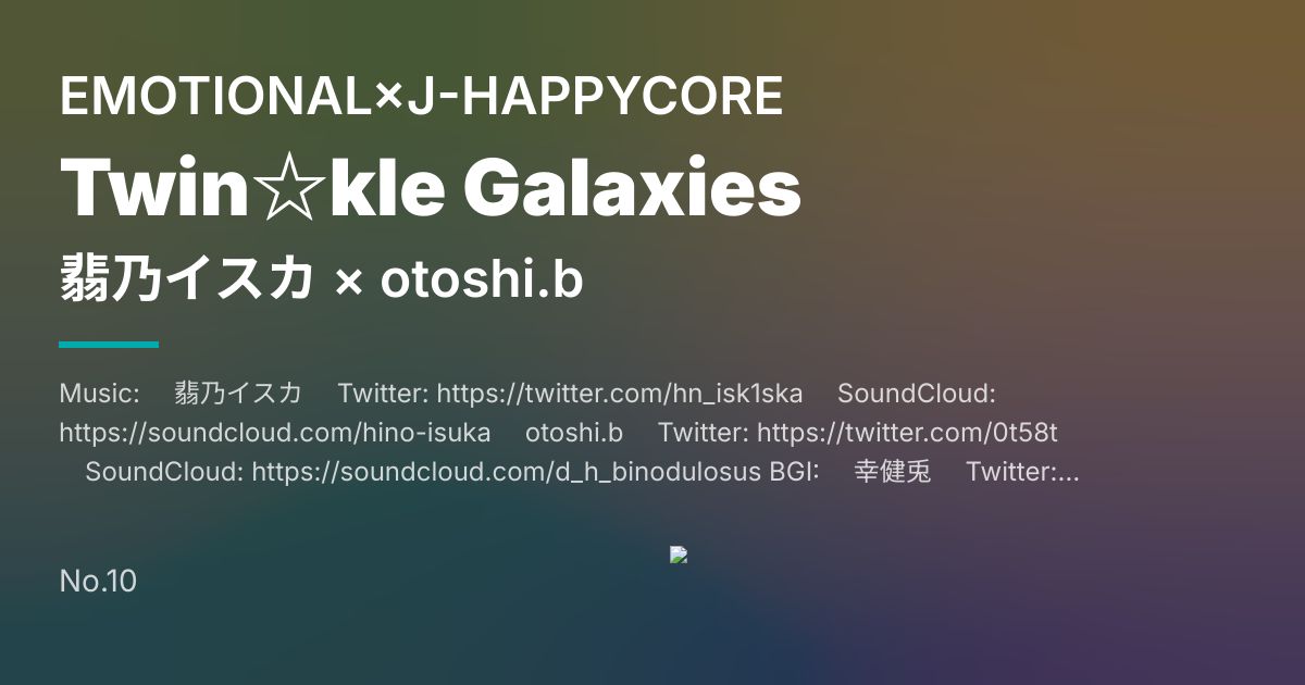 Music: 翡乃イスカ Twitter: https://twitter.com/hn_isk1ska SoundCloud: https://soundcloud.com/hino-isuka otoshi.b Twitter: https://twitter.com/0t58t SoundCloud: https://soundcloud.com/d_h_binodulosus BGI: 幸健兎 Twitter: https://twitter.com/tozimari_Kento はしたかさん Twitter: https://twitter.com/Hstk_Mega 発狂譜面: BAECON Twitter: https://twitter.com/BAECON57 SP Normal ☆☆☆☆☆ 5 SP Hyper ☆☆☆☆☆☆☆☆☆☆ 10 SP Another ☆☆☆☆☆☆☆☆☆☆☆☆ 12 (発狂★3) SP Insane ☆☆☆☆☆☆☆☆☆☆☆☆ 12 (発狂★9) SP Fortunate Groove ☆☆☆☆☆☆☆☆☆☆☆☆ 12 (発狂★19, sl11-12) SP Journey 2 Sparkling Galaxies!! ☆☆☆☆☆☆☆☆☆☆☆☆ 12 (発狂★24, st4-5) ───────────────────────────────────────── こんにちは!初めまして!翡乃イスカです。一年ぶりくらいのBMS制作になります! 今回は最近の気鋭のBMS作家、otoshi.bさんからお声掛け頂きまして合作させて頂く運びとなりました! 2人の長所を活かしあったエモーショナル×ハッピーな楽曲になったなと思います。 曲の終盤で僕たちの曲で聞き覚えのある人はあるフレーズを入れ込んでいるんですが、 その曲に込めた想いのうちの一つの「追う側、追われる側の繋がり」って言うのを感じられる曲になったんじゃないかなーと思ったりしています(隙あらば自分語り) 譜面も幅広い難易度で楽しめるようにみんなで作りました!ぜひぜひ楽しんでいってください! [翡乃イスカ] ───────────────────────────────────────── 今までずっとハピコアBMSを作ってきて良かったと、心の底から思えるような作品になりました。 僕は幸せ者です。 最高のBMS、是非楽しんでいって下さい!!よろしくお願いします!!!! [otoshi.b] ───────────────────────────────────────── 幸健兎ともうします。 今回ははしたかさんと楽しく合作させていただきました! こはねちゃんとシャイナちゃんの可愛さがすっごく詰まったBGIになったと思います!!! ミスしても二人に癒されて何度もイスカさんとotoshi.bさんの最高サウンドをノリノリで楽しんでください! [幸健兎] ───────────────────────────────────────── 今回もotoshi.bさんに誘われてBGIを描かせて頂ける事になりました! ...のですがなんと合作でしかもその相手がイスカさん!ひええ...! 幸健兎さんと協力して曲に合ったキラキラ可愛いBGIを目指してみましたー! シャイナちゃんを幸健兎さん、こはねちゃんを自分が担当して絵でも合作! 非常に楽しかったです! [はしたかさん] ───────────────────────────────────────── 今回発狂譜面3つを担当させて頂いたBAECONです。 このような素晴らしい、「本気」の曲の譜面を担当させていただき大変うれしく思います。 発狂譜面を触り始めた人から発狂皆伝レベルの方まで、幅広い層のプレイヤーの皆さんにこの曲を楽しんでいただけるよう、 幅広い難易度帯の譜面をご用意しました。 NORMAL~ANOTHER譜面もいい感じに楽しめる譜面となっております。 皆様のプレイをお待ちしております! [BAECON] ─────────────────────────────────────────