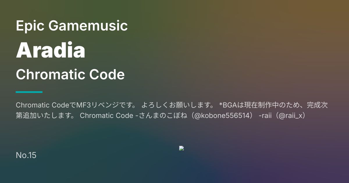 Chromatic CodeでMF3リベンジです。 よろしくお願いします。 *BGAは現在制作中のため、完成次第追加いたします。 Chromatic Code -さんまのこぼね(@kobone556514) -raii(@raii_x)
