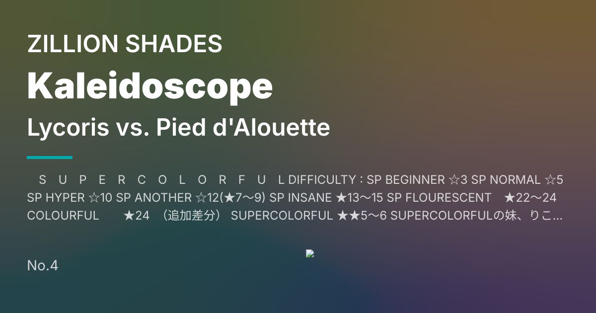S U P E R C O L O R F U L DIFFICULTY : SP BEGINNER ☆3 SP NORMAL ☆5 SP HYPER ☆10 SP ANOTHER ☆12(★7~9) SP INSANE ★13~15 SP FLOURESCENT ★22~24 COLOURFUL ★24 (追加差分) SUPERCOLORFUL ★★5~6 SUPERCOLORFULの妹、りこりす・らぢあーたと申すりこ。この度は兄が譜面でお騒がせしてしまい、大変申し訳ございませんりこ…お詫びのしるしに、SUPERCOLORFULの下位互換譜面を作ったりこ。これならりこでも楽しくあそべるりこ!難易度表記とは裏腹にとても遊びやすくて楽しい譜面なので今この文章を読んでいる人は遊ぶりこね。 りこりす・らぢあーたたむの妹、qfeileadhと申します。この度はりこがとんでもないBMSを制作してしまい、大変申し訳ございませんでした。TOTAL2位Ave優勝という高評価、ありがとうございました。りこも満足しています。イベント優勝まで行けなかったのが残念ですが、ミキシング能力が及ばなかったりこ…と反省していました。次はもっと本気出すとのことです。応援よろしくお願いします。