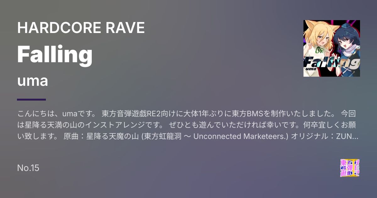 こんにちは、umaです。 東方音弾遊戯RE2向けに大体1年ぶりに東方BMSを制作いたしました。 今回は星降る天満の山のインストアレンジです。 ぜひとも遊んでいただければ幸いです。何卒宜しくお願い致します。 原曲:星降る天魔の山 (東方虹龍洞 ~ Unconnected Marketeers.) オリジナル:ZUN アレンジ:uma イラスト:柏原まな BGA:adaptor