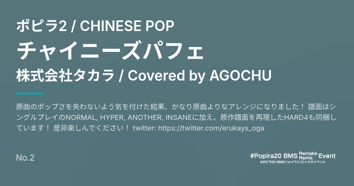 原曲のポップさを失わないよう気を付けた結果、かなり原曲よりなアレンジになりました! 譜面はシングルプレイのNORMAL, HYPER, ANOTHER, INSANEに加え、原作譜面を再現したHARD4も同梱しています! 是非楽しんでください! twitter: https://twitter.com/erukays_oga