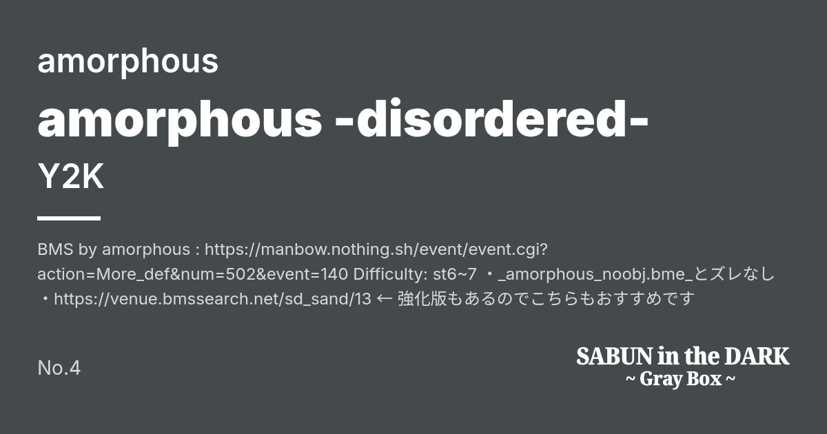 BMS by amorphous : https://manbow.nothing.sh/event/event.cgi?action=More_def&num=502&event=140 Difficulty: st6~7 ・_amorphous_noobj.bme_とズレなし ・https://venue.bmssearch.net/sd_sand/13 ← 強化版もあるのでこちらもおすすめです