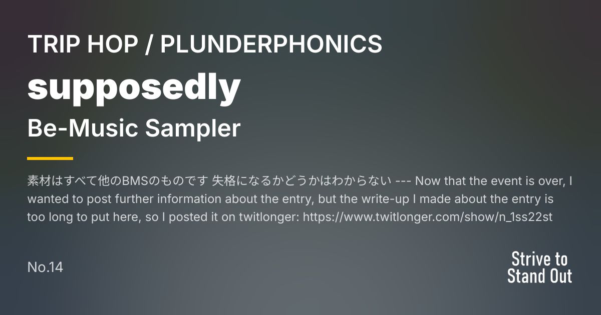 素材はすべて他のBMSのものです 失格になるかどうかはわからない --- Now that the event is over, I wanted to post further information about the entry, but the write-up I made about the entry is too long to put here, so I posted it on twitlonger: https://www.twitlonger.com/show/n_1ss22st