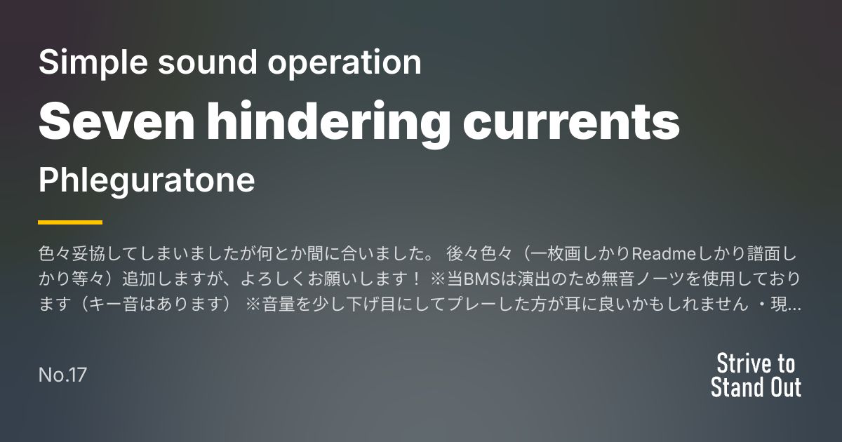 色々妥協してしまいましたが何とか間に合いました。 後々色々(一枚画しかりReadmeしかり譜面しかり等々)追加しますが、よろしくお願いします! ※当BMSは演出のため無音ノーツを使用しております(キー音はあります) ※音量を少し下げ目にしてプレーした方が耳に良いかもしれません ・現在の収録譜面(7KEY ONLY) ☆1 start ☆7 mute button (short ver.) ・修正/追加履歴 2022/5/16 0:50 ogg_short版を追加。