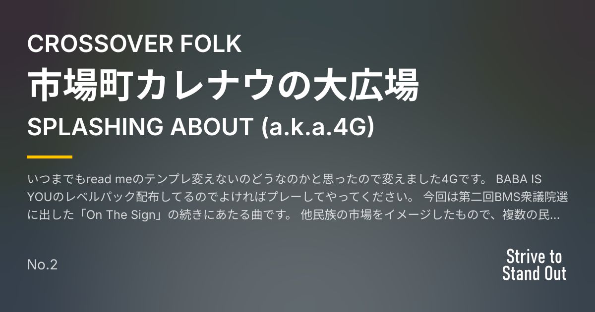 いつまでもread meのテンプレ変えないのどうなのかと思ったので変えました4Gです。 BABA IS YOUのレベルパック配布してるのでよければプレーしてやってください。 今回は第二回BMS衆議院選に出した「On The Sign」の続きにあたる曲です。 他民族の市場をイメージしたもので、複数の民族音楽をミックスしてみました。 DPI譜面以外はPL法守ってます。SPはA譜面まで、DPはH譜面までフルコン済。