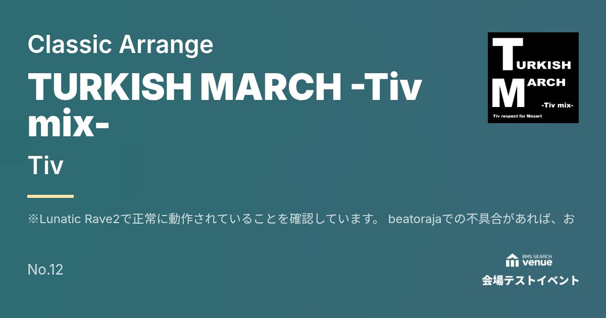 ※Lunatic Rave2で正常に動作されていることを確認しています。 beatorajaでの不具合があれば、お手数をおかけしますが連絡をお願いします。 --------------------------------------------------- 唐突にイベント外でBMS出してどうしたんだよということで、まあ簡単に言えば「12月に音切りしてからBMS化作業を全くしてなかったのでリハビリしたかったから」と、「何故かトルコ行進曲のアレンジをしたくなったから」の2つが理由です。 音切り作業は12月にRainy Day Morning Gloryで行って以来全然してませんでした。この2ヶ月作曲オンリー。 スキルはそれなりに身についたけどこのままではまずいと思い、リハビリも兼ねて最近作ったトルコ行進曲のアレンジを選びました。 じゃあなんでトルコ行進曲なん?唐突に作りたくなったから。 小2の頃聴いた記憶のある「トルコ行進曲(Hd-NRG mix)」に最近再会(すぐBMSも導入)して、あー俺も作りてぇなぁ?ってなって、 作曲そっちのけで深夜3時まで2時間で作りました。バカかよ。 みなさんはこんなアホなことせずさっさと寝ましょう。 影響受けまくってるので所々Hd-NRG mixの面影があったりなかったり。 それを3時間くらいかけて手直しして完成したのがこれです。 クラシックのアレンジなので、イベントに出すのはまずいかなと思い、BMS Search venueのテスト会場に登録させていただきました。 Pupulyはコピアレがだめみたいなので…。 X(Twitter)(気ままに更新中) https://twitter.com/tivmusic_chp SoundCloud(色々上げたり上げなかったり) https://soundcloud.com/tivremisuke note(たまーにブログ的な何かを。過去のBMSも保管中) https://note.com/tiv_03sk YouTube(BGAや音源などを気まぐれで投稿) https://www.youtube.com/channel/UC3pMoThTt8gpoAHPsNfIi8Q 連絡用メアド(TwitterのDMが出来ない場合の問い合わせやリンク切れ報告に) tivdirectmass@gmail.com