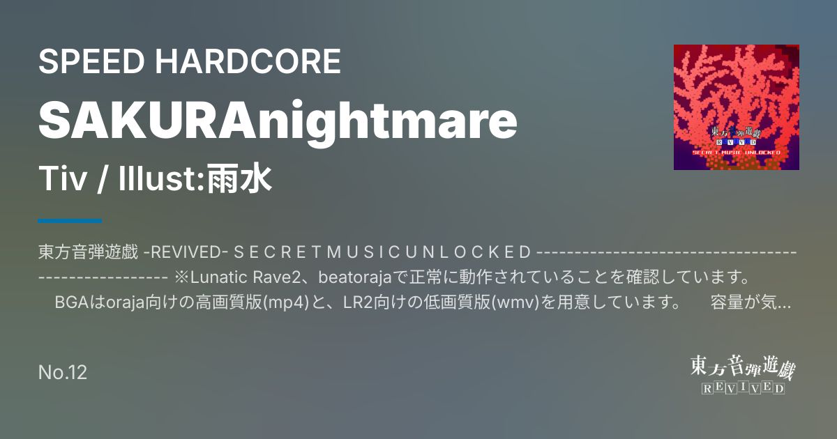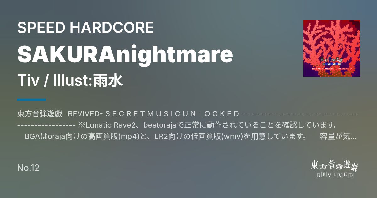 東方音弾遊戯 -REVIVED- S E C R E T M U S I C U N L O C K E D --------------------------------------------------- ※Lunatic Rave2、beatorajaで正常に動作されていることを確認しています。 BGAはoraja向けの高画質版(mp4)と、LR2向けの低画質版(wmv)を用意しています。 容量が気になる方は不要なほうを削除することを推奨します。 --------------------------------------------------- -夜桜の舞うこの地に、弾幕の灯火が輝き出す。- Title:SAKURAnightmare Genre:SPEED HARDCORE BPM:205 Arranged:Tiv【X(Twitter):@tivmusic_chp】 Original Artist:ZUN Original Music:幽雅に咲かせ、墨染の桜 ~ Border of Life(東方妖々夢より) BGA:Tiv Illustration:雨水【X:@Amamizu_Prastik】&【@Amamizu_08】 --------------------------------------------------- Arranged:Tiv 音弾遊戯二曲目、コンセプトはズバリ「ボス曲」です。 どおりで会場に登録されてるジャケットがそれっぽかったわけだ(他人事) そもそも原曲が6面の曲なのであんま変わらないかもですけど…。 まあ、「音ゲーのボス曲」というくくりで結構激しいアレンジのつもりです。 原曲の方は前々から好んで聴いていて、「サビのメロディいいよなぁ」と思ってたんですけど、 東方アレンジを実際に作りはじめてみてから聴くと、「あれ、このメロディ16分にしたらカッコよくなるんじゃね?」 と思うようになって、そこからアレンジ制作に繋がったというわけです。 せっかくメロディを16分にしたんならBPMは速い方が疾走感あるように聴こえるんじゃないんでしょうか。 それで試作したわけです。原曲のカリスマ性も相まって、めちゃくちゃ「ボス曲」っぽく聴こえたんです。 これだ!と思い、カッコいい全開のボスアレンジを念頭に置いて完成させましたとさ。 あと、桜と夜って結構相性が良くて風情を感じますよね。それも思い出して、「夜戦」というイメージもついて、 よりボス曲っぽくなったかなと感じてます。 こちらの作品もBGAは自作となっております。2作品ともBGA自作で、しかも実写なしは今回だけだと思います。 BGAに登場する幽々子様の素敵なイラストは、音ゲー仲間の雨水さんに描いていただきました。 この度はありがとうございました! ボスっぽい雰囲気に見合うカッコいいデザインでありつつも、紳士には刺さるような感じがもう最高で…。 9鍵譜面の練習として当作に2つ9Keys譜面を同梱しています。 ご意見お待ちしております。 ボス曲イメージのめちゃくちゃ気合が入っている自信作なので、お楽しみいただけると幸いです。 X(Twitter)(気ままに更新中) https://twitter.com/tivmusic_chp SoundCloud(色々上げたり上げなかったり) https://soundcloud.com/tivremisuke note(たまーにブログ的な何かを。過去のBMSも保管中) https://note.com/tiv_03sk YouTube(BGAや音源などを気まぐれで投稿) https://www.youtube.com/channel/UC3pMoThTt8gpoAHPsNfIi8Q 連絡用メアド(TwitterのDMが出来ない場合の問い合わせやリンク切れ報告に) tivdirectmass@gmail.com --------------------------------------------------- Illustration:雨水 今回、初のイラスト担当させていただきました雨水です。 初めて依頼されたので完成度はそこまで高くないですけど クライアント様に納得いただけましたので、完成しきることが出来ました。 制作のお話になりますが、近未来衣装が全然分からなくて、 資料探しして、自分らしさを考えた結果、スク水みたいな感じなったのが及第点……。 現在、絵柄やパーツ、人体等の描き方を研究して もっと透明感あるようイラストに仕上げていけるよう活躍していきます。 またどこかの機会で知ることが出来たらいいですね。 --------------------------------------------------- 譜面一覧 7keys BEGINNER ☆4 NORMAL ☆8 HYPER ☆11 ANOTHER ☆12 LostPetals 発狂向け(☆0) 9keys HYPER ☆41 EX ☆47