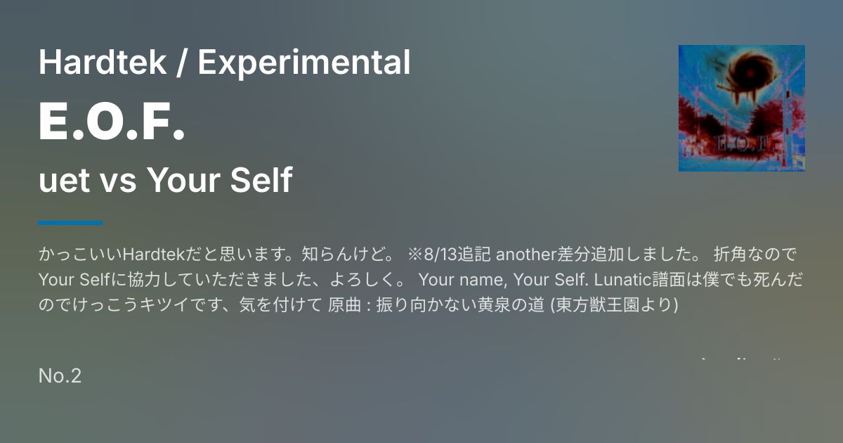 かっこいいHardtekだと思います。知らんけど。 ※8/13追記 another差分追加しました。 折角なのでYour Selfに協力していただきました、よろしく。 Your name, Your Self. Lunatic譜面は僕でも死んだのでけっこうキツイです、気を付けて 原曲 : 振り向かない黄泉の道 (東方獣王園より)