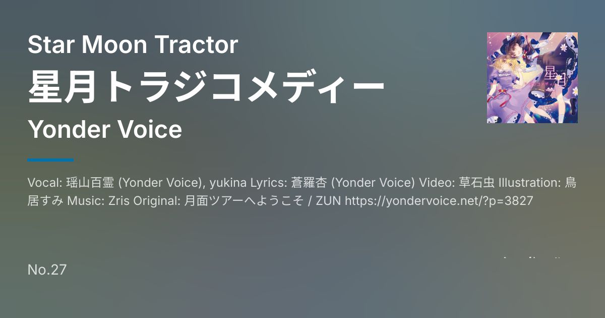 Vocal: 瑶山百霊 (Yonder Voice), yukina Lyrics: 蒼羅杏 (Yonder Voice) Video: 草石虫 Illustration: 鳥居すみ Music: Zris Original: 月面ツアーへようこそ / ZUN https://yondervoice.net/?p=3827
