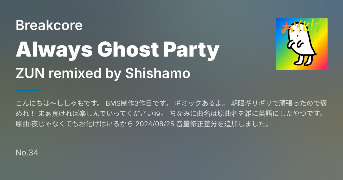 こんにちは~ししゃもです。 BMS制作3作目です。 ギミックあるよ。 期限ギリギリで頑張ったので褒めれ! まぁ良ければ楽しんでいってくださいね。 ちなみに曲名は原曲名を雑に英語にしたやつです。 原曲:夜じゃなくてもお化けはいるから 2024/08/25 音量修正差分を追加しました。