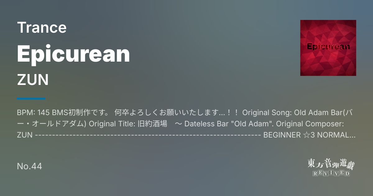 BPM: 145 BMS初制作です。 何卒よろしくお願いいたします…!! Original Song: Old Adam Bar(バー・オールドアダム) Original Title: 旧約酒場 ~ Dateless Bar "Old Adam". Original Composer: ZUN ------------------------------------------------------------------ BEGINNER ☆3 NORMAL ☆4 HYPER ☆7 ------------------------------------------------------------------ (2024.08.21) プレビュー音源が再生されなかった問題を修正しました。 (_preview.ogg→_preview.wavに変更)