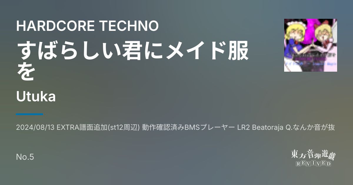 2024/08/13 EXTRA譜面追加(st12周辺) 動作確認済みBMSプレーヤー LR2 Beatoraja Q.なんか音が抜ける(beatoraja) A.同時発音数がかなり多い曲になっているので Audio>同時発音数を256以上に設定すると改善される可能性があります。 Title : すばらしい君にメイド服を Original : メイド幻想 ~ Icemilk Magic (東方幻想郷より) Artist : Utuka (Original : zun) [Easy] ▽5~6 [Normal] ▽11周辺 [Hard] ▽12-周辺 [Lunatic] sl1周辺 [EXTRA] st12周辺