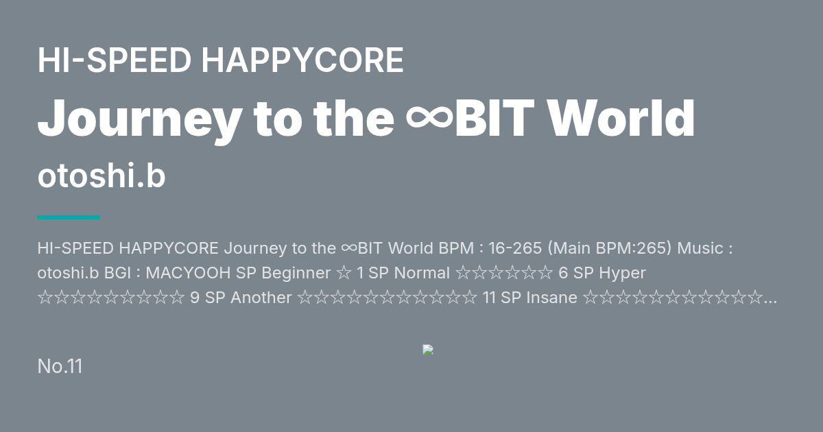HI-SPEED HAPPYCORE Journey to the ∞BIT World BPM : 16-265 (Main BPM:265) Music : otoshi.b BGI : MACYOOH SP Beginner ☆ 1 SP Normal ☆☆☆☆☆☆ 6 SP Hyper ☆☆☆☆☆☆☆☆☆ 9 SP Another ☆☆☆☆☆☆☆☆☆☆☆ 11 SP Insane ☆☆☆☆☆☆☆☆☆☆☆☆ 12 (発狂★4-6相当) SP Divergence ☆☆☆☆☆☆☆☆☆☆☆☆ 12 (発狂★24相当) 初めましての方は初めまして、お久しぶりの方はお久しぶりです、otoshi.bです。 今回、個人としては2回目のBMS制作、イベント出場となります。 BMS初制作だった無名戦14で3位というかなりの高成績を残せたのは非常に嬉しかったのですが、その反面、「今回結果を出せなかったらどうしよう...」とプレッシャーがヤバく禿げそうになっています。まあとにかく今の自分の力を出し切って曲も譜面も大幅にパワーアップした作品になったと思っておりますので、是非是非プレイの方よろしくお願い致します。