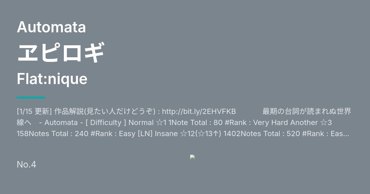 [1/15 更新] 作品解説(見たい人だけどうぞ) : http://bit.ly/2EHVFKB 最期の台詞が読まれぬ世界線へ - Automata - [ Difficulty ] Normal ☆1 1Note Total : 80 #Rank : Very Hard Another ☆3 158Notes Total : 240 #Rank : Easy [LN] Insane ☆12(☆13↑) 1402Notes Total : 520 #Rank : Easy [LN] * 【!】インプレでの指摘よりN譜面プレイ時にはキー音とBGMのバランスは1:1としてください。 * Lunatic Rave 2推奨。 * SoundCloud : https://soundcloud.com/ayumu_tail/vfpq02 * ReadmeのNormal譜面の[LN]は間違いです。申し訳ありません。 -- Flat:niqueです。本作のテーマは「遺書」です。 N譜面にはあるギミックを仕掛けており、プレイヤーのある簡単な行動により 主人公の進む世界線が変化し、エンディングが変化します。 A・I譜面はおまけとして音楽ゲームとして比較的プレイアブルなものとして 制作しました。また、本作はとある方々をリスペクトして制作致しました。 いつもとまた違った世界観をお楽しみください。 -- a-mと申します。 BOFUに続き、初めてチャレンジするタイプの作品です。 BMSの方もちょっと変わった試み…ということで 大変、好奇心を刺激されました。 是非、この静かに棘を刺すような物語をプレイヤーのあなたにも。 私は辿り着けない